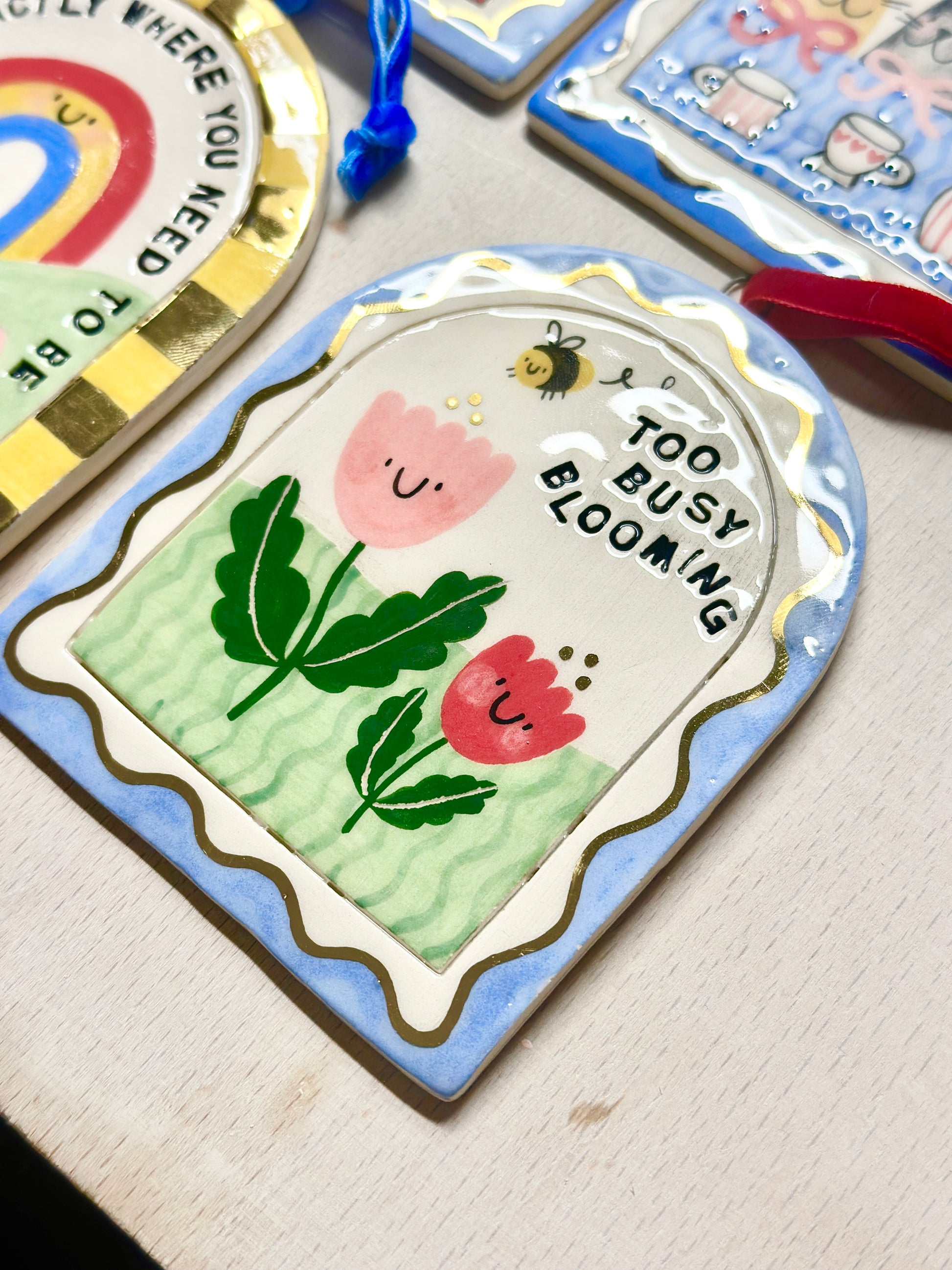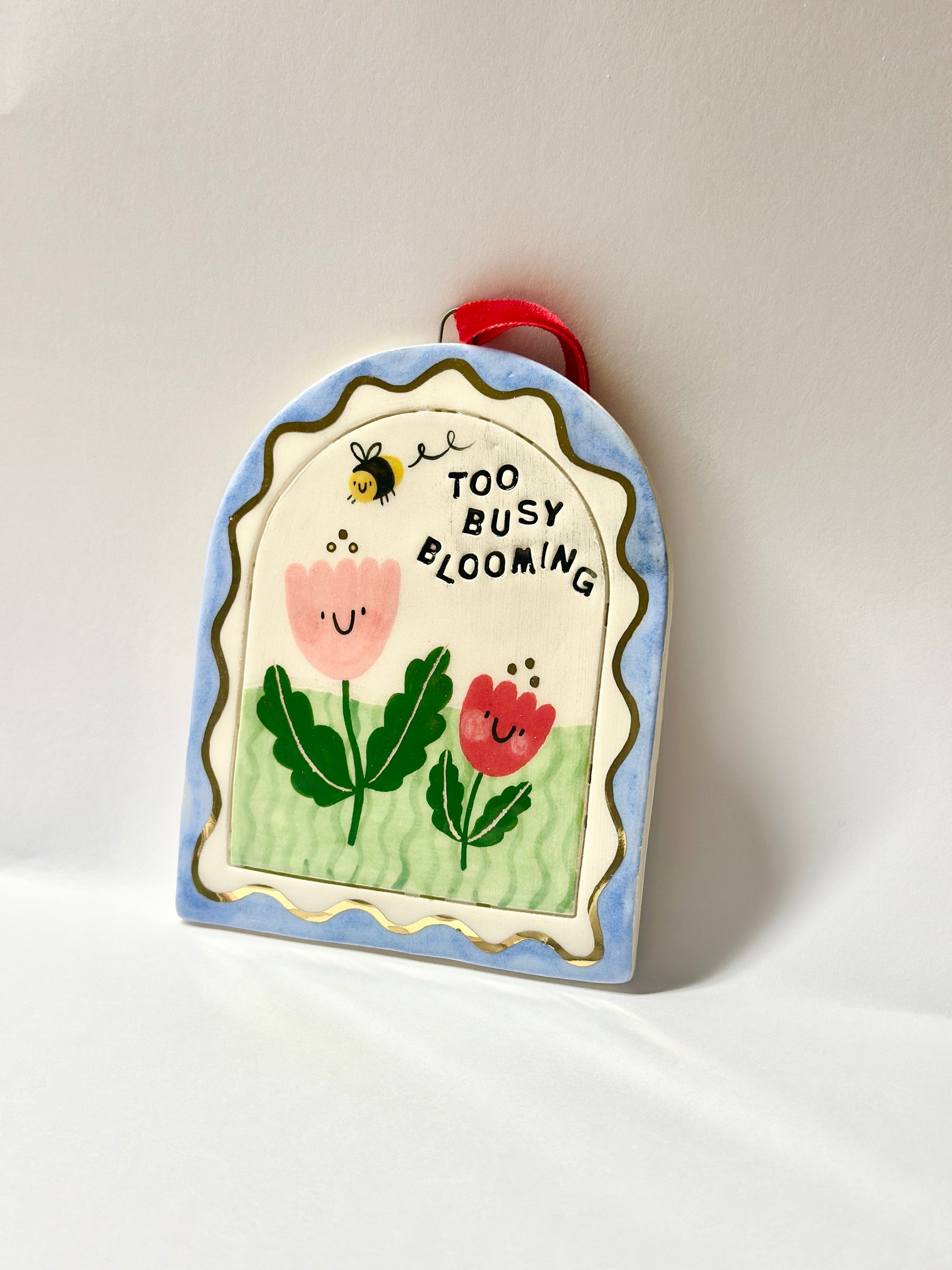 Handmade ceramic arch with hand-painted details and gold lustre finish. Suspended on a velvet ribbon for easy hanging. At approximately 10cm x 12cm, it's the perfect size to tuck into a cosy corner, cluster with other pieces, or display as a standalone statement. A little touch of artisanal magic for spaces that deserve it.